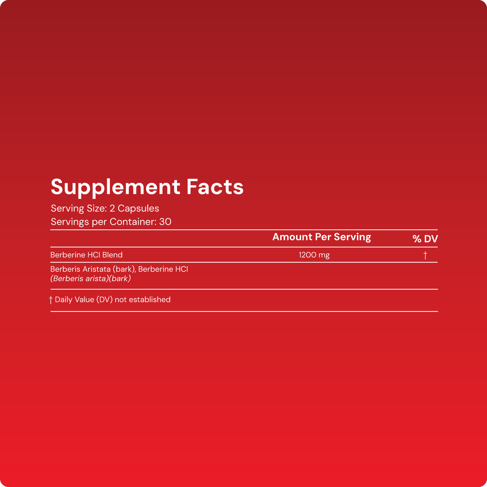 This powerful metabolic formula delivers 1200mg of Berberine HCl Blend from Berberis aristata bark, providing high-potency berberine hydrochloride for optimal absorption and effectiveness. Delivered in Hypromellose capsule with Rice Flour, Rice Maltodextrin, and Magnesium Stearate.
