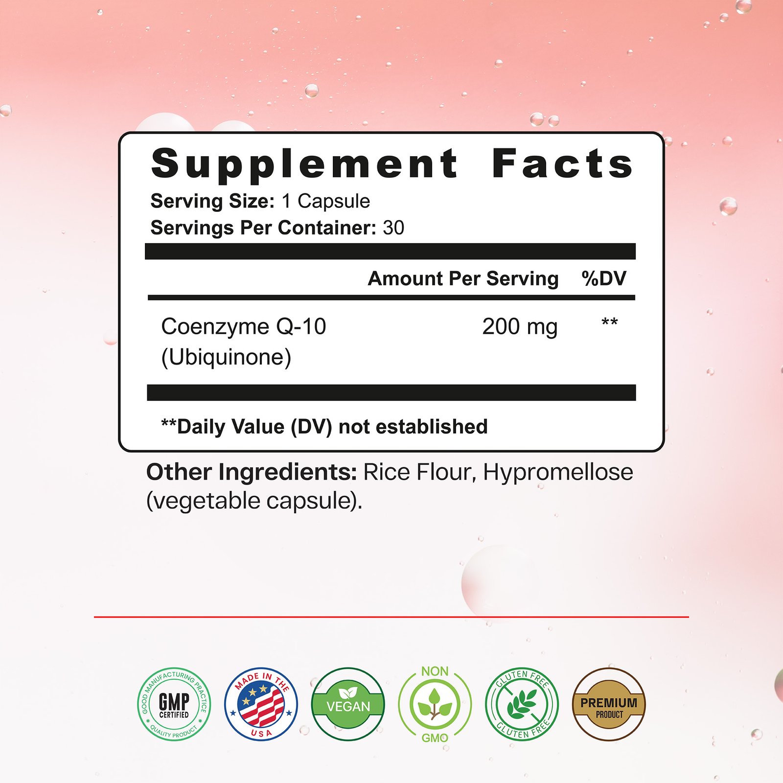 This potent formula delivers 200mg of Coenzyme Q-10 (Ubiquinone) to support mitochondrial function, cellular energy production, and antioxidant defense. Combined with Rice Flour and Hypromellose (vegetable capsule) for optimal absorption and bioavailability.