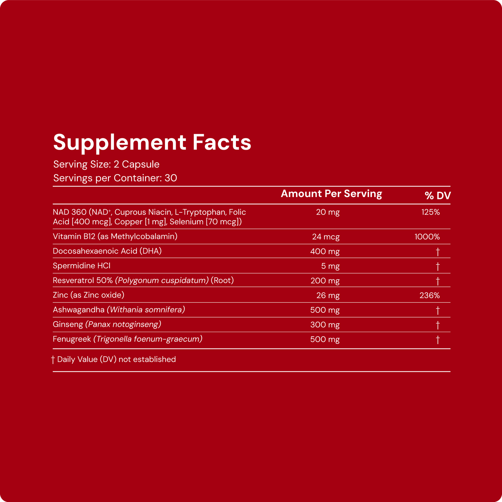 This advanced men’s formula targets the 12 hallmarks of aging with a potent blend of NAD360® (Wasabi Extract, Theacrine, Cuprous Niacin), Yuth™ (Spermidine HCl), DHA and Resveratrol to boost NAD⁺, support autophagy and enhance mitochondrial health.