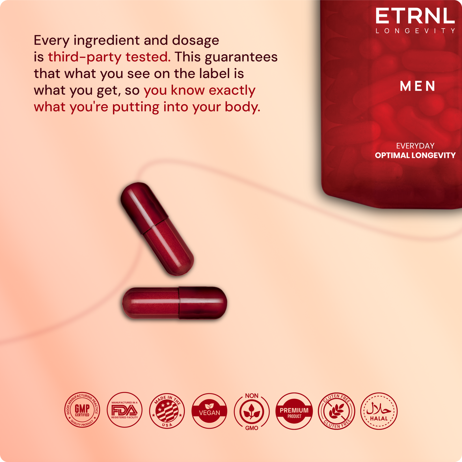 Every ingredient and dosage in ETRNL is rigorously third-party tested. That means full transparency and peace of mind.