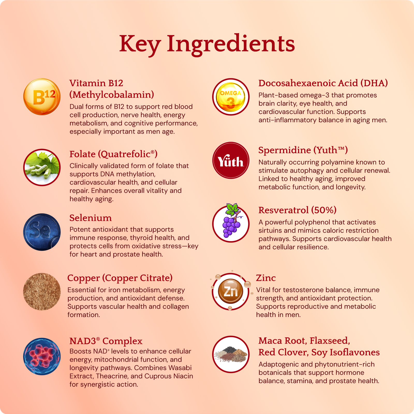 Essential nutrients like Niacinamide, Methylcobalamin (B12), Quatrefolic®, Selenium and Copper power core metabolic functions, DNA repair and antioxidant defense—supporting vitality, cognition and heart health for men aging with strength and clarity.