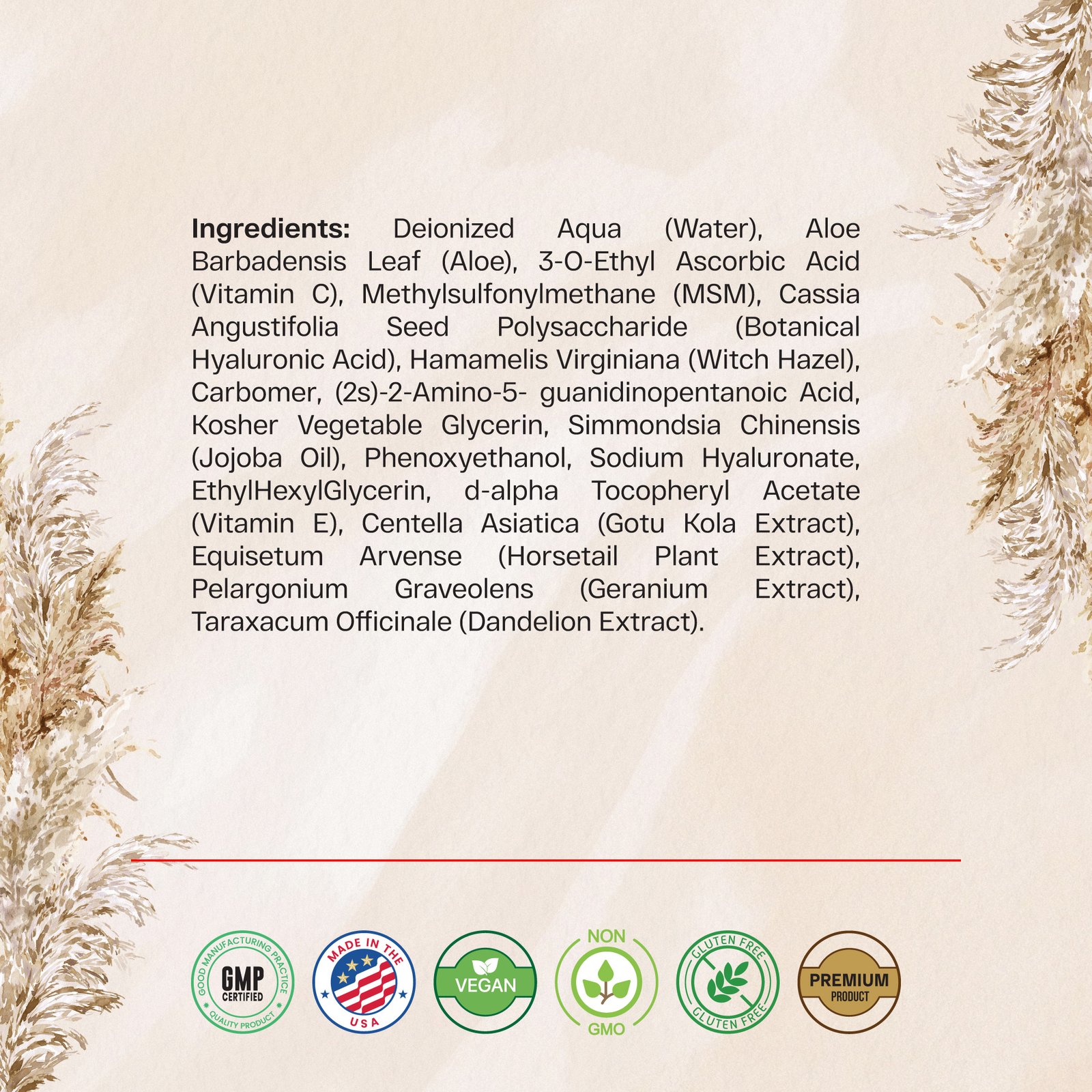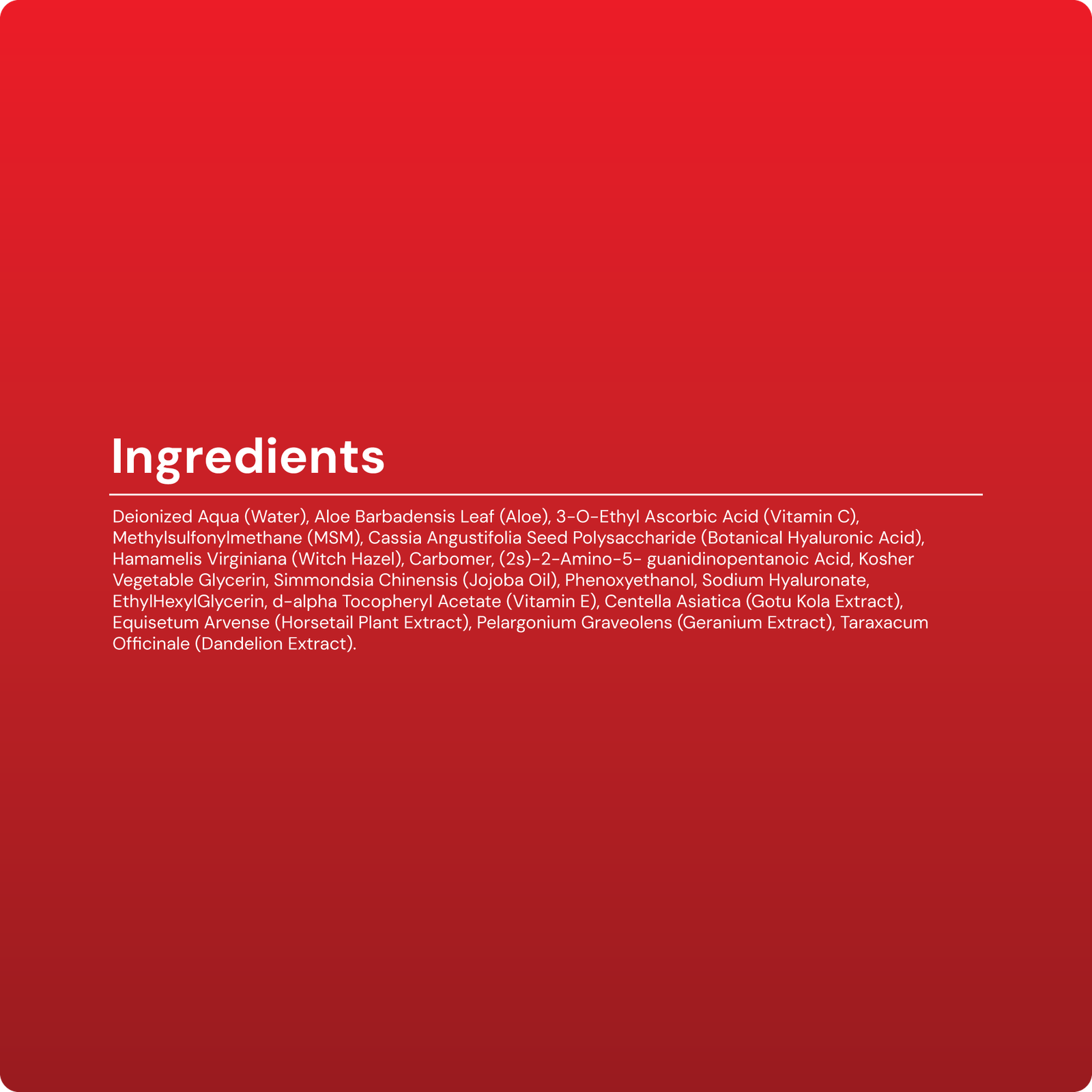 This advanced skin formula features Deionized Aqua, Aloe Barbadensis Leaf (Aloe), 3-O-Ethyl Ascorbic Acid (Vitamin C), Methylsulfonylmethane (MSM), Cassia Angustifolia Seed Polysaccharide (Botanical Hyaluronic Acid), Hamamelis Virginiana (Witch Hazel), Carbomer, L-Arginine, Kosher Vegetable Glycerin, Simmondsia Chinensis (Jojoba Oil), Phenoxyethanol, Sodium Hyaluronate, EthylHexylGlycerin, d-alpha Tocopheryl Acetate (Vitamin E), Centella Asiatica (Gotu Kola Extract), Equisetum Arvense (Horsetail Plant Extract), Pelargonium Graveolens (Geranium Extract), and Taraxacum Officinale (Dandelion Extract). This comprehensive blend delivers antioxidant protection, hydration, and skin renewal support.